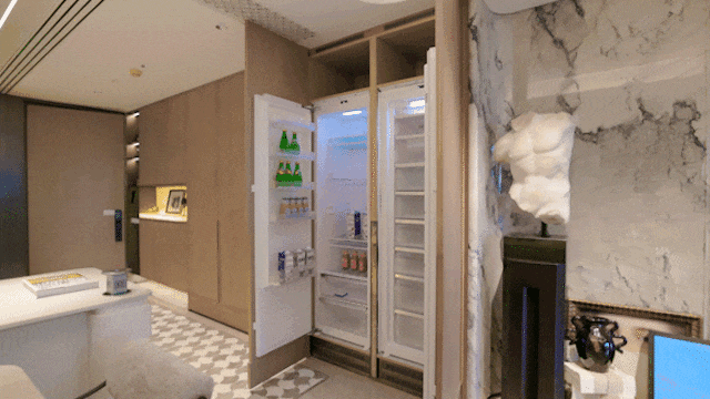 海上·清和玺预约热线:400-8080-420☎✅厨房墙面岩板通铺,开门采用水波纹玻璃+金属造型边框的玻璃移门,顶部配置线性凉霸+LED嵌入式回形灯带+筒灯,细节考量全方位。