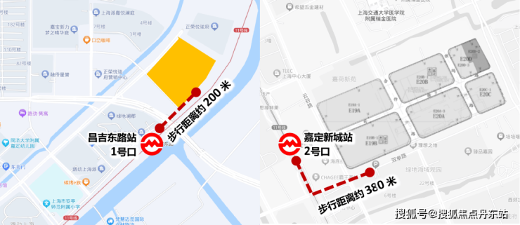 事实确实如此,我们将二者到最近地铁口的路线测距后发现,虽然理想之地直线距离地铁站很近,但即便是最西侧的地块,步行到地铁站也需要380米。