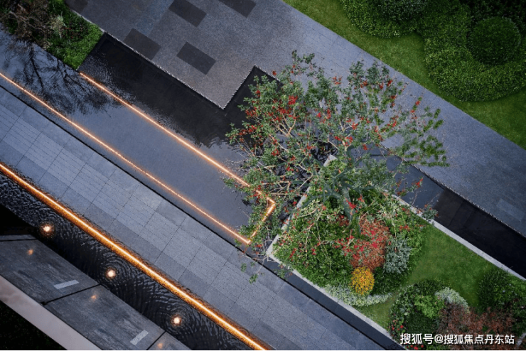 从空中俯瞰,跌水水景、亲水平台、色叶树阵等多重景观交融,展开一幅无与伦比的山水画卷。