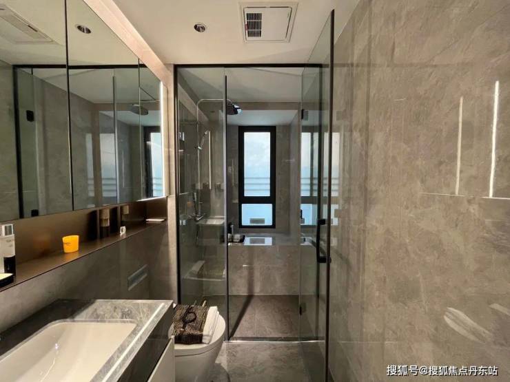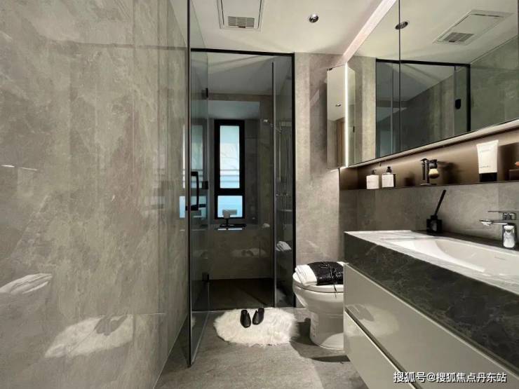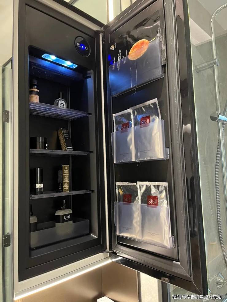 主卧卫生间,镜柜别出心裁的配有“美妆冰箱”,可以满足业主对美妆用品冷藏的需求!可以说,上海10万+单价的项目中也没几个项目可以做到这么细致的。