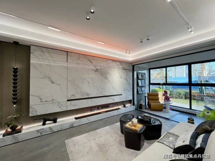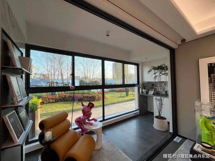而阳台和客厅之间是无墙垛设计的,实际交付时不封阳台(此处为临时样板间),可以想象,走进室内一眼望去只有窗外的风景,整体空间是非常通透敞亮的。