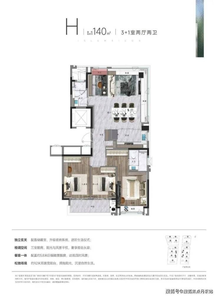 约140㎡3+1房,拥有一个约270度的转角厅,视野出众。