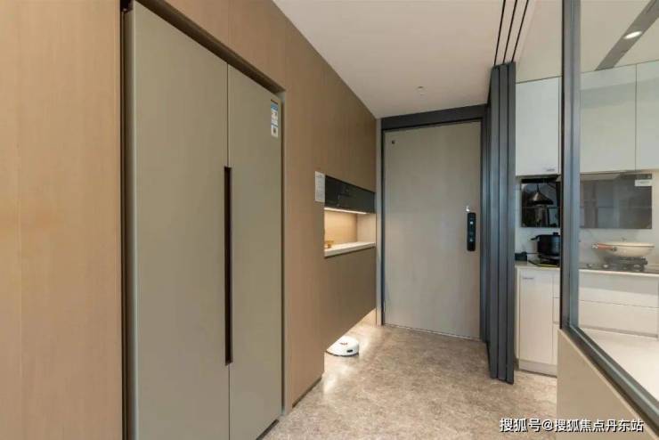 入户玄关的设置,边上还可以打造一个收纳空间。不管后期是用来放双开门冰箱,亦或者是其他杂物都可以。