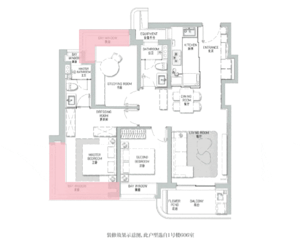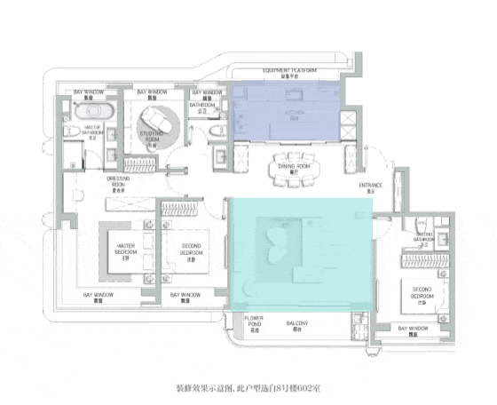 其格局与约112㎡户型大致相仿,但得益于边套位置,主卧与北房间均巧妙配置了转角飘窗,观景视野更佳。