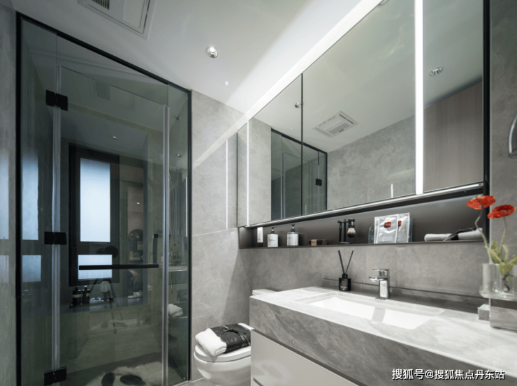 在卫生间,主卧镜柜内置美妆冰箱,方便女主人储物各种面膜,化妆品等物件。