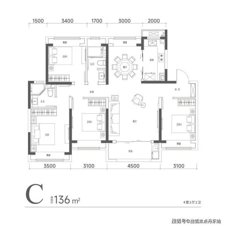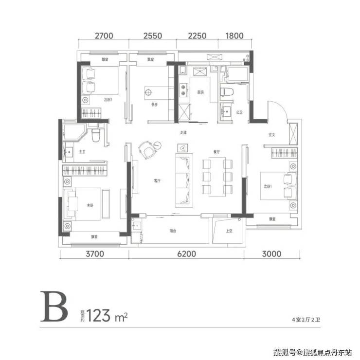 客厅横厅布局,面宽约6.2米;餐厅独立,宽度达3.25米,可放置多人就餐圆桌;南向三卧,双套房设计,主卧面宽约3.7米,带衣帽间、淋浴、浴缸。次房间宽也达3.3米;两个小房间开间也有3米和2.9米,都能放大床。另外,客厅连接约8㎡大阳台(不封阳台,算一半面积),整个社交区域方正、阔绰,待客、休闲皆从容自在。6个飘窗设置(不算面积)更很好延展了室内空间。在入户仪式感上,该户型还享独立电梯厅入户。
