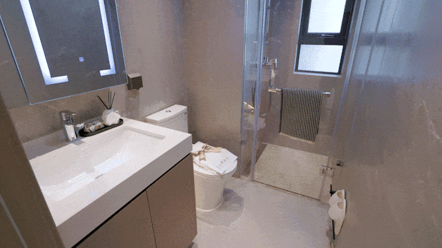 至于卫浴空间,则配置唯宝一体式智能坐便器,龙头和花洒也采用高仪品牌,更配有电热毛巾架,收纳功能超足的镜柜,对生活质感的投入,从头贯穿到尾,以同等标准照顾每位家人的使用舒适度。