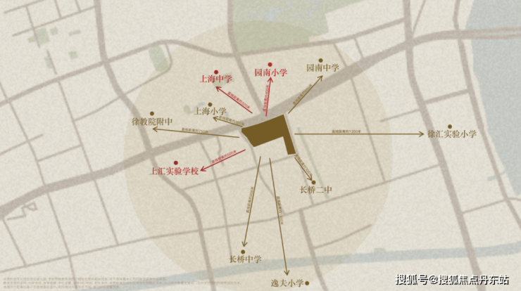 项目直线距离上海“四校”之首的上海中学仅约320米;直线距离九年一贯制上汇实验学校约500米;直线距离园南小学、园南中学分别约400米和650米。