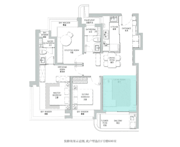 其格局与约112㎡户型大致相仿,但得益于边套位置,主卧与北房间均巧妙配置了转角飘窗,观景视野更佳。