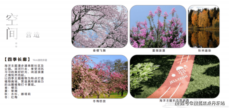 春日漫步樱谷、夏季粉黛团簇、入秋杉林听涛、凛冬梅香扑鼻,项目以色彩视觉手法,通过春夏秋冬四季布局,演绎出时移境迁的时光故事。