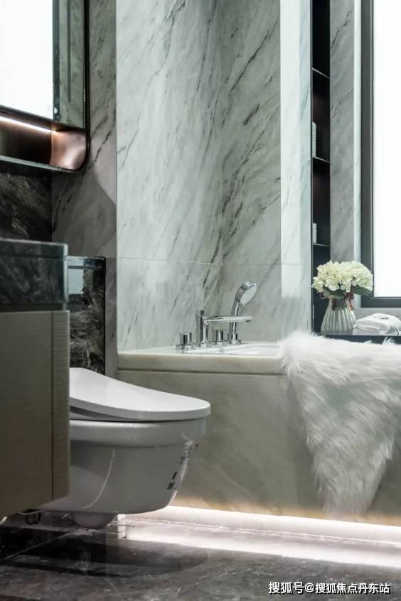 主客卫统一采用欧洲卫浴瑰宝德国唯宝的悬挂式洁具,底部空间完全悬空更易于日常清洁,冲水按钮设置洁具侧面墙上,伸手即可一键冲水,尽显金茂府3.0对人居更深层次的理解。