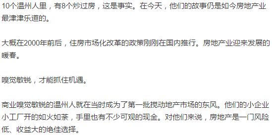 1998年到2001年,温州的民间资本大量投入当地房地产,促使当地房地产价格以的,市区房价快速从2000元/平方米左右,飙升到7000元/平方米以上。初尝喜悦的温州人,在全国人民尚未觉醒的时候,迅速向全国城市扩大战果。