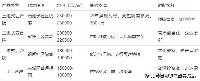 投资方向:重点布局三进式四合院(稀缺性最强),其次是二进式,一进式增值空间相对有限;